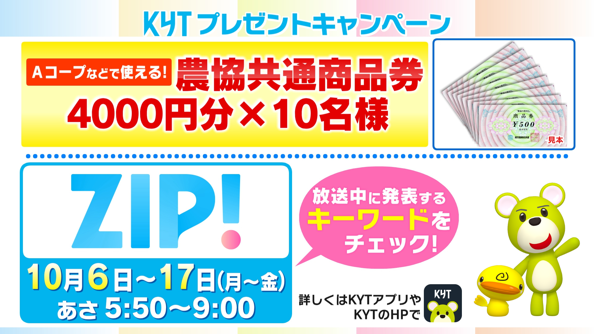 10月6日~17日(月-金)までの2週間、「ZIP!」(5:50~9:00)の放送中にキーワードを発表します。そのキーワードと必要事項を応募フォームに入力のうえ、KYTアプリからご応募ください。