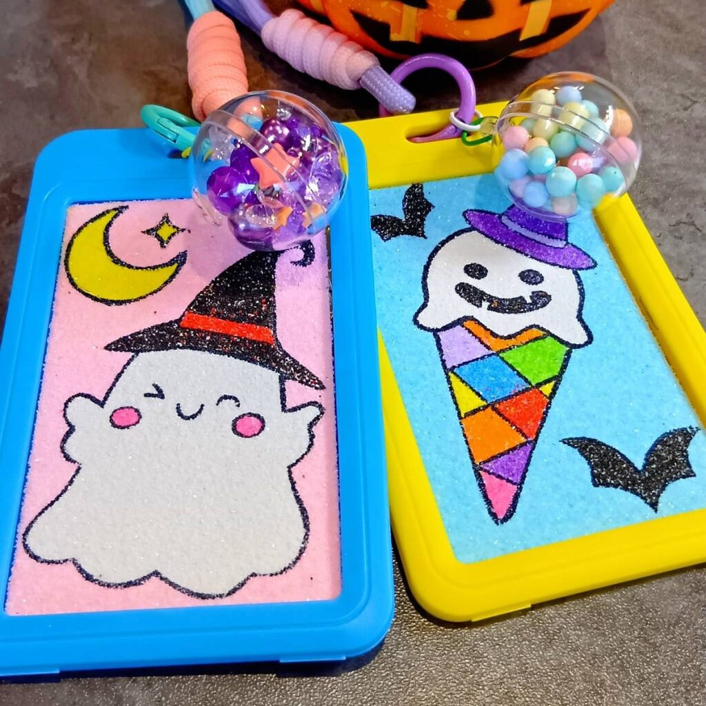 かわいいハロウィンデザインをカラフルな色砂で色付けをして、自分だけのオリジナルチャームを作ります♪ワクワクの砂絵体験しませんか?