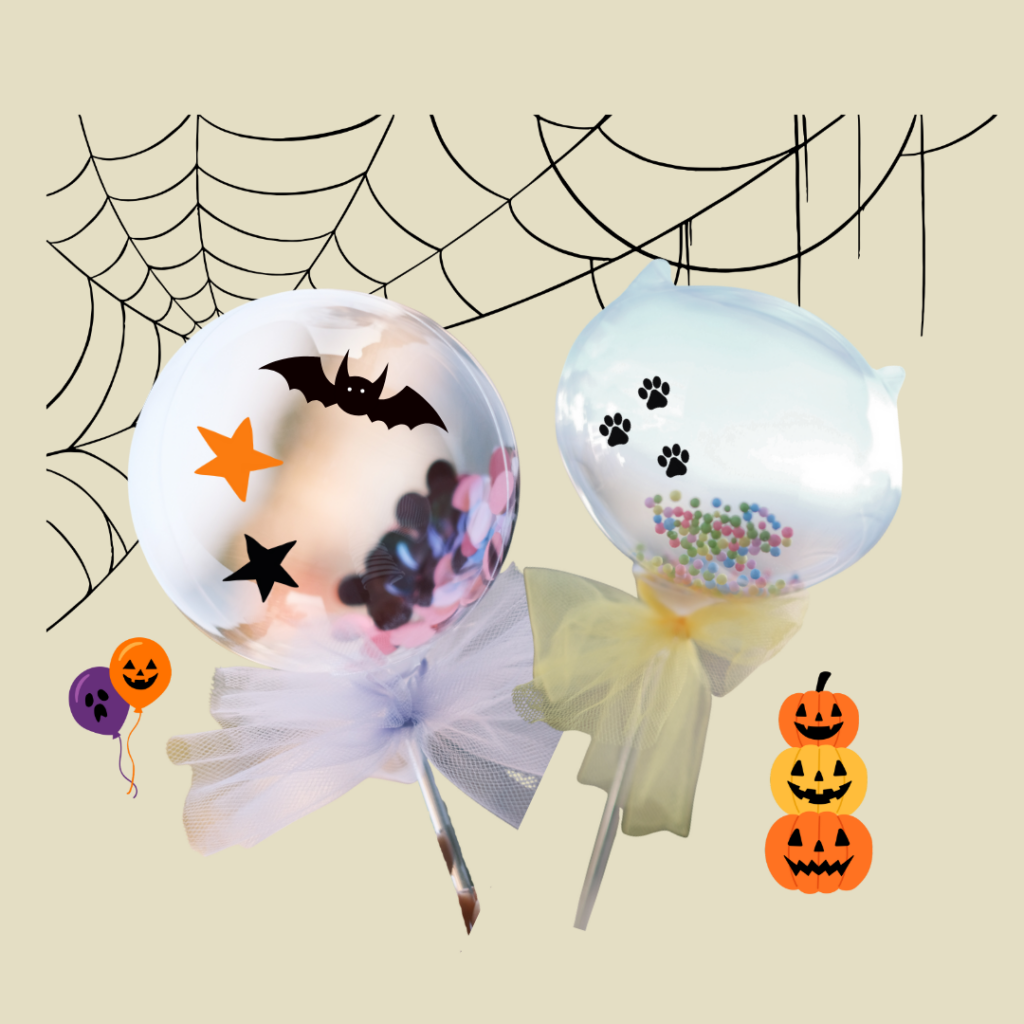 ハロウィンにちなんだカラーやアイテムで透明なバルーンを飾って、楽しいハロウィンの思い出を作ろう!