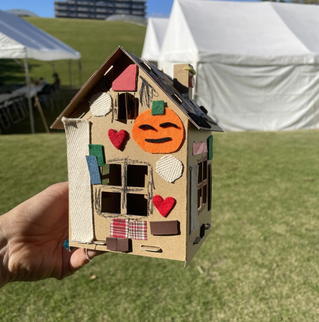 組み立てかんたんなダンボールのミニチュアハウスに、クレヨンをぬったりいろいろなものをはりつけたりして、ハロウィンハウスをつくろう!