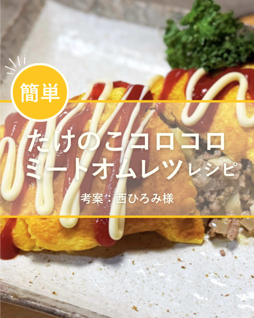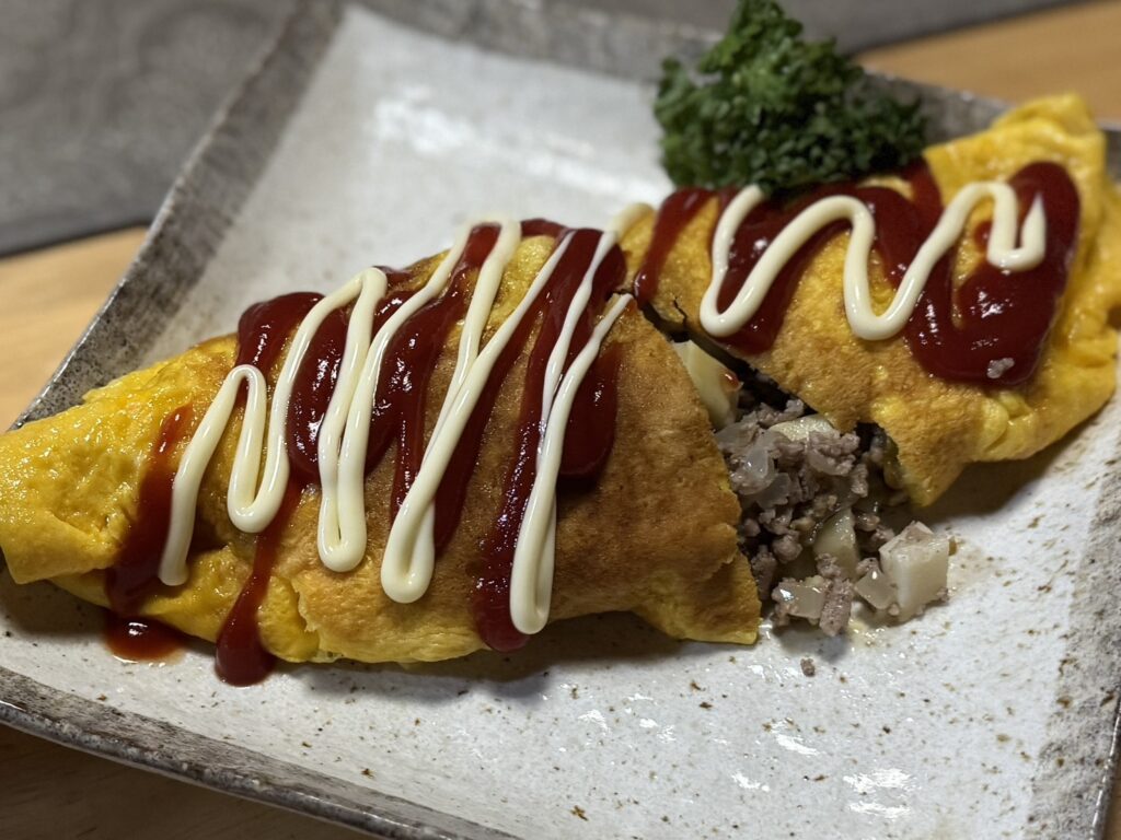 | ④ | フライパンを綺麗にして油を熱し、薄焼き卵を作る 具材を入れて包み皿に取りだしたら、ケチャップをマヨネーズをかける |