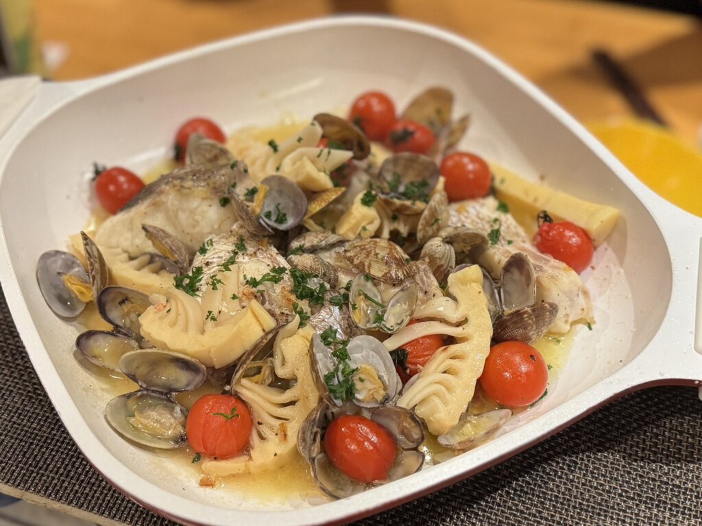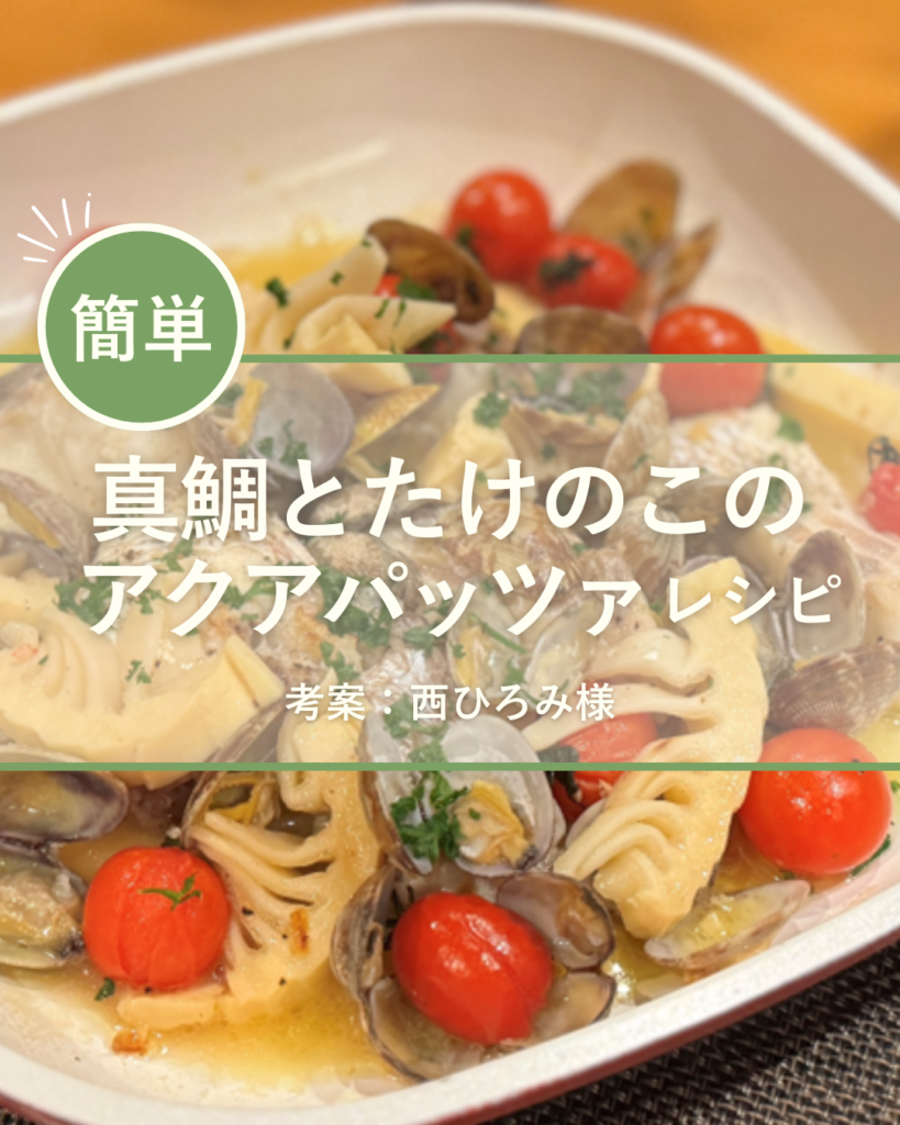 | ① | 真鯛は食べやすい大きさに切り、塩をふっておく あさりは砂抜きをし、よく洗う タケノコは食べやすい大きさに切る にんにくはみじん切りにする |