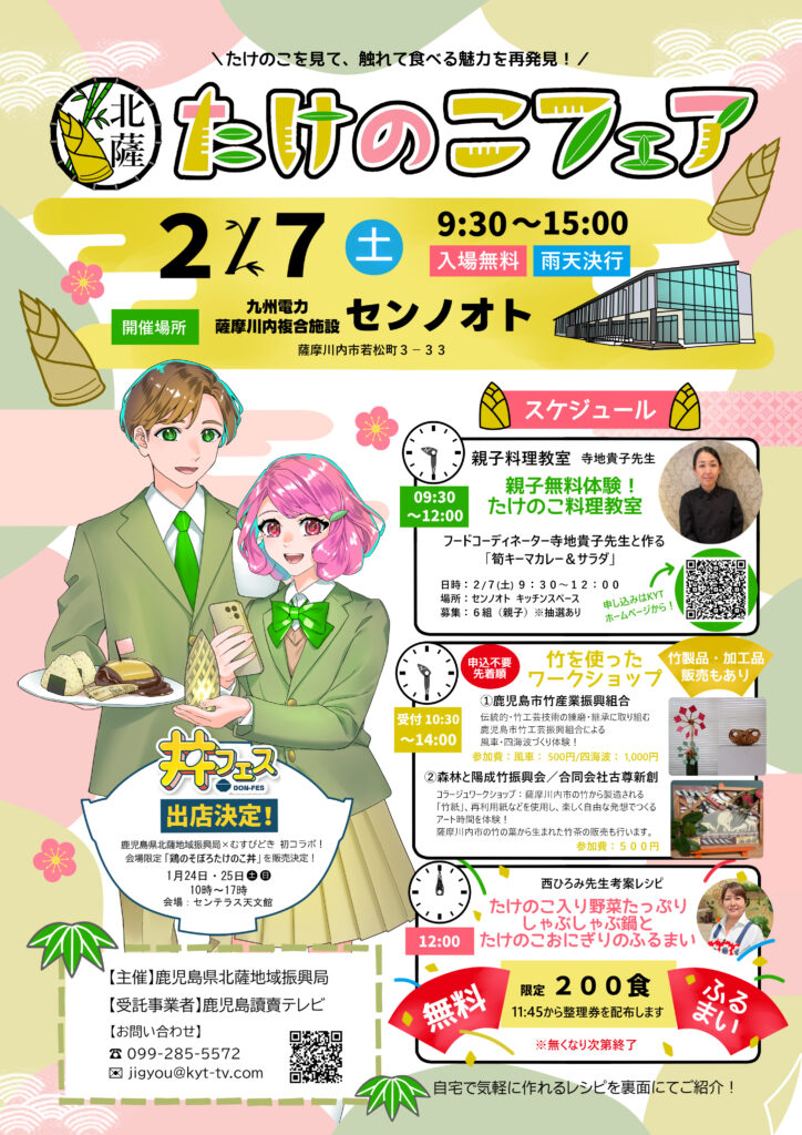 | イベント名 | 親子で無料体験!たけのこ料理教室 in センノオト 筍のキーマカレー&サラダを作ろう! ~ 鹿児島県産たけのこを楽しく学ぶ!親子料理教室 ~ |